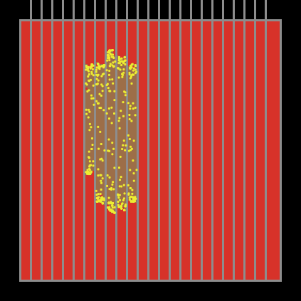 This project simulates a nuclear fission reaction in a nuclear power plant. In a fission reaction, free neutrons hit uranium atoms, causing each uranium atom to generate 2 or 3 neutrons and a unit of energy. The uranium atom itself splits into two smaller atoms. The newly generated neutrons, together with the neutron that caused the reaction, keep moving and continue to hit more uranium atoms, which release more neutrons, etc. This is the chain reaction that happens inside an atomic bomb.