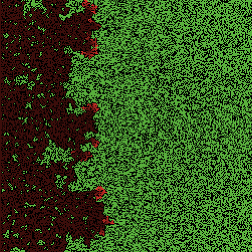 This project simulates the spread of a fire through a forest. It shows that the fire's chance of reaching the right edge of the forest depends critically on the density of trees. This is an example of a common feature of complex systems, the presence of a non-linear threshold or critical parameter.