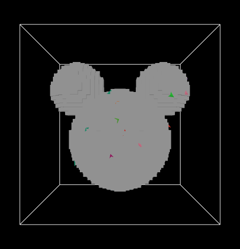 Select "Mickey Mouse" from the SURFACE-SHAPE chooser. SETUP and tell the model to GO. What happens to turtles when they pass over the acute angles where Mickey's ears meet his head? Try adjusting the STEP-SIZE slider while the model is running to investigate.