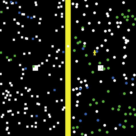 The presence of the virus in the population is represented by the colors of individuals. Four colors are used: white individuals are uninfected, red individuals are infected, green individuals are recovered, and blue individuals are inoculated. Once recovered, the individual is permanently immune to the virus. The yellow person symbolizes the health official or ambulance, who patrols the world in search of ill people. Once coming in contact with an infected individual, the ambulance immediately delivers the infected to the hospital within the region of residence.