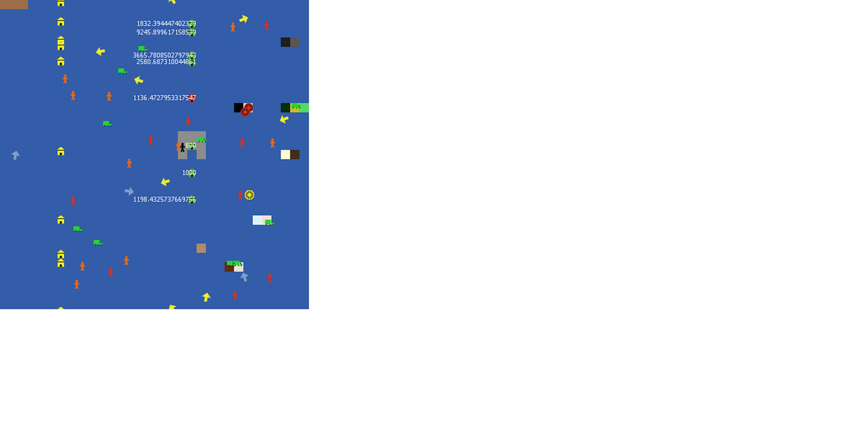 globals [hist eh cho history d ptc ptc1 r manufr xx xx2 po y z w g maxlife ind vg vg1 vg2 vg3 vg4 vg5 vg6 vg7 vg8 vg9 vg10 vg11 vg12 vg13 vg14 vg15 mhtime totord ss pm d1 d2 d3 d4 d5 d6 d7 d8 d9 d10 winner win jack mcor maxbusy maxact maxsuc din damage fk maxloan typeo glob twork eh2 typ1 typ2 typ3 typ4] breed [knowag knw] ;; knowledge agent breed [manuf ma] ;; manufacturer breed [distr dist] ;; distributer breed [techag tch] ;; technology agent breed [rmatag rmat] ;; raw material agent breed [comag cag] ;; communication agent breed [crvty crvt];; creativity agent breed [competitors cmp]; breed [dcen dcend] directed-link-breed [streets street] directed-link-breed [streets1 street1] directed-link-breed [swats swat] directed-link-breed [channel chan] distr-own [demand cdem kdem timefor twill will past wages cdeml qulr fest ecost mak oppertunity perils setcost runcost] manuf-own [truck expenditure chul kul certified loan ex arc perception wealth nom nmatt mreq active sklr crvreq capacity pos lev rating temperament life ambition ordfl ftime manage status setst info1 info2 info3 info4 info5 info6 budtech glo anarchy bor orig cost suc pay dbos cont matflag assets style qul vision curios experience rgn1 rgn2 rgn3 rgn4 ofcap rgn5 rgn6 rgn7 rgn8 rgn9 rgn10 proactive when international htime tky standard socialize dums credit ito w2 learn itime] ;; manufacturer's variables techag-own [wealth level tecost hird hasten];; tp satisfaction att];; tech agent's var rmatag-own [wealth matt sdist pickup bsss address reached ondemand yor];; mp pric];; rawmat ag var comag-own [wealth distanc speed ab bc de ef gh boss v1 vt2 comcost];; comp satisfaction inf att] ;; comm ag var knowag-own [wealth kp satisfaction skl kcost];; att];; know ag var crvty-own [wealth ccp fun ccost];; satisfaction vis att] dcen-own [bsno] competitors-own [ver1 ver2 ver3 loser] patches-own [resistance rest units mine] to setup ;; setting it up __clear-all-and-reset-ticks create-knowag 10 create-techag 10 create-rmatag 10 create-comag 10 create-manuf 10 create-distr 10 create-crvty 10 create-competitors comp set history 10 set hist (count manuf) ask patches [ if pycor > 1 [ set rest (abs pycor)] ;; if pycor < 1 ;; [ set rest (-1 * pycor)] set resistance (rest + resistor) set mine random-normal 100 200 set pcolor blue if (pxcor > 7 and pxcor < 10 and pycor = -12) or (pxcor > 8 and pxcor < 11 and pycor = 5) or (pxcor > 10 and pxcor < 13 and pycor = -7) or (pxcor > 15 and pxcor < 18 and pycor = 5) or (pxcor > 13 and pxcor < 16 and pycor = 12) or (pxcor > 13 and pxcor < 16 and pycor = 0) [ set pcolor (random 100)]] ask knowag [set shape "person" set skl random 30 set kcost ((random 8) + skl / 10)] ask manuf [set shape "house" set wealth 1000 set assets random-normal 5000 5000 set socialize random-normal 2 4 set learn random-normal 3 5 set standard abs random-normal 500 1000 set proactive abs random-normal 1000 1500 set temperament random-normal 500 300 set ambition random-normal 5000 1000 set curios random-normal 50 30 set orig random-normal 0 1 set capacity random 300 set ofcap (capacity - random 20) if ofcap < 0 [set ofcap random 50] set when random 10 if when < 0 [ set when random 10 ] set perception random-normal 1000 500 if perception < 0 [set perception random-normal 1000 500] set style random 100 set cost random 5 + suc / 20 if capacity = 0 [set capacity random 50] set sklr random 40 set ordfl -10 set crvreq random 80] ;; manufacturer's have wealth =1000 at the start ask distr [set shape "house" set color green set kdem random 30 set cdem random 80 set wages random 10] ask competitors [set shape "house" set color orange];; ask rmatag [set shape "truck" set color lime set matt random 10] ask techag [ set shape "wheel" set tecost random 30 + level set hasten random 5 if (pxcor > 4 and pxcor < 6 and pycor = -10) or (pxcor > 4 and pxcor < 6 and pycor = -5) or (pxcor > 4 and pxcor < 6 and pycor = 0) or (pxcor > 4 and pxcor < 6 and pycor = 5) or (pxcor > 4 and pxcor < 6 and pycor = 0) or (pxcor > 4 and pxcor < 6 and pycor = 12) [ set level random 10]] ask crvty [set shape "person" set fun random 50 set ccost random 5] ask comag [ set shape "arrow" set color blue + 2 set distanc random 9 set speed random 2 if distanc > 9 [set distanc (distanc / 2)] if speed > 4 [set speed (speed / 2)]] ask comag [let zd (0) ask one-of manuf [ set zd who] set v1 (zd) set boss zd set comcost (random 2)] ask manuf [ set color red set xcor 4 set color green set sklr (random 40) set nmatt (random 10) set bor (random-normal 5000 200000) set pay (random-float 0.5) ;; set vision random-normal 50 60 if pay < 0.2 [set pay (random-float 0.5)] set ycor (random-normal 0 10) if any? manuf in-radius .25 [ask one-of manuf [ set ycor (ycor + .5)] if any? manuf in-radius .5 [ask one-of manuf [ set ycor (ycor + 1)]]]] ask distr [ set oppertunity random-normal 2 3 set perils random 12 set runcost random 2 if runcost < 1 [set runcost random 2] set setcost random-normal 5000 1000 if setcost < 5000 [ set setcost random-normal 20000 10000] set color red set xcor -10 set color yellow set mak random 3 set ycor (random-normal 0 10) if any? distr in-radius .25 [ ask one-of distr [ set ycor (ycor + .5)] if any? distr in-radius 1 [ask one-of distr [ set ycor (ycor + 1)]]]] ask competitors [set ycor 12 set color red set xcor (random-normal 0 10)] end to go tick if ticks > 100000 [stop] ask knowag ;; movement of agents < 55 [ ifelse pcolor > gray or pcolor < gray [ fd 1 if xcor < -10 [set xcor 0 fd 1]] [if color = 0 [ stop]]] ask techag [if color = red [ifelse (pcolor > blue or pcolor < blue) [stop] [ fd 2 if xcor < -10 [ set xcor 0 fd 2]]]] ask rmatag [if color = lime [ifelse pcolor != blue [ if (pcolor != gray) [ stop] ] [ fd 2 if xcor < -10 [set xcor 0 fd 2]]] ] ask comag [fd speed] ask crvty [ifelse pcolor > gray or pcolor < gray [ fd 1 if xcor < -10 [ set xcor 0 fd 1]] [if color = 0 [ stop]]] failuresit setdmd setchar environment exhibition certificate team setstatus bus buspast fan