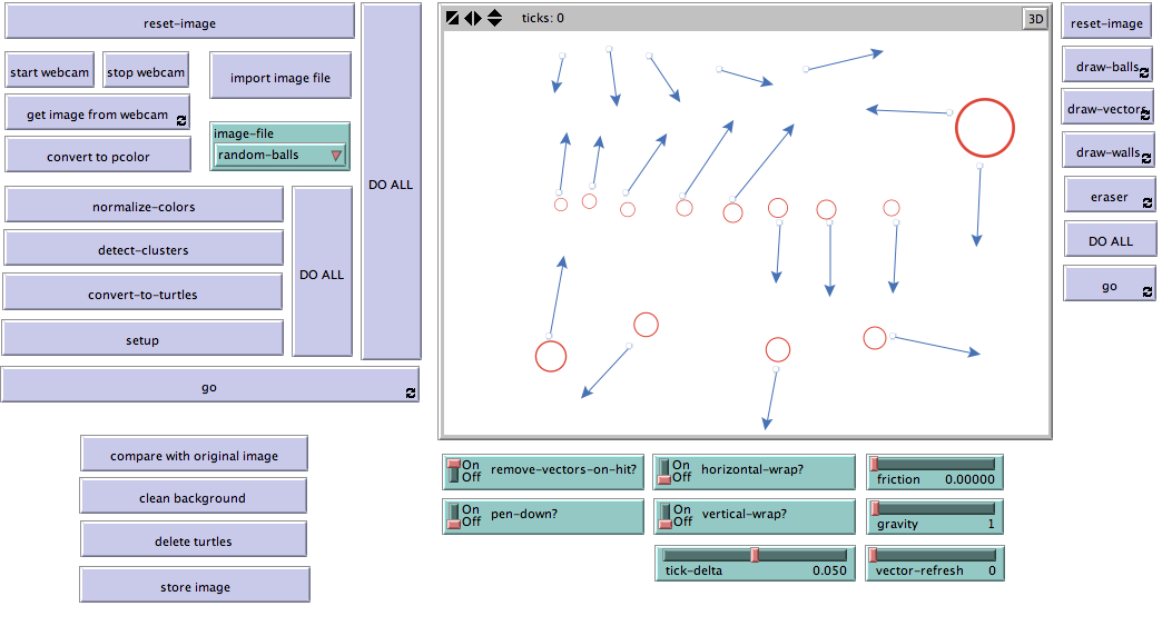 extensions [bitmap qtj] breed [vectors vector] breed [balls ball] vectors-own [vector-size head-turtle] balls-own [speed energy last-collision last-vector] patches-own [cluster previous-color] globals [ circle-patches line-patches wall-patches circle-clusters line-clusters max-tick-delta background-color] to reset-image clear-all set background-color 9.9 ask patches [set cluster nobody set pcolor background-color] set-default-shape balls "circle 2" set-default-shape vectors "circle 2" reset-ticks end to reset-background ask patches [set pcolor background-color] end to import-image let myimage "images/random-balls.png" if image-file = "random-balls" [set myimage "images/random-balls.png"] if image-file = "force-field" [set myimage "images/force-field.png"] if image-file = "current" [set myimage "images/current.png"] import-pcolors myimage end to normalize-colors set circle-patches patches with [(pcolor > 11 and pcolor < 18) or (pcolor > 121 and pcolor < 128) or (pcolor > 131 and pcolor < 138)] set line-patches patches with [shade-of? blue pcolor = true] set wall-patches patches with [pcolor >= 0 and pcolor <= 1] reset-background ask circle-patches [set pcolor 15] ask line-patches [set pcolor 105] ask wall-patches [set pcolor 0] end to detect-clusters let drawing-patches (patch-set circle-patches line-patches) if any? drawing-patches with [cluster = nobody] [ let counter 1 set circle-clusters [] set line-clusters [] loop [ let seed one-of drawing-patches with [cluster = nobody] if seed = nobody [ stop ] ask seed [ set cluster counter grow-cluster ifelse pcolor = red [set circle-clusters lput counter circle-clusters] [set line-clusters lput counter line-clusters] ] set counter counter + 1 ] ] end to grow-cluster ;; patch procedure ;ask neighbors with [(cluster = nobody) and ask patches in-radius 2 with [(cluster = nobody) and ;ask neighbors4 with [(cluster = nobody) and (pcolor = [pcolor] of myself)] [ set cluster [cluster] of myself grow-cluster ] end to convert-to-turtles reset-background ask wall-patches [set pcolor 0] foreach circle-clusters [ if count (patches with [cluster = ?]) > 5 [generate-circles patches with [cluster = ?]] ] foreach line-clusters [ if count (patches with [cluster = ?]) > 5 [generate-lines patches with [cluster = ?] ?] ] end to generate-circles [shape-patch-set] let max-x-point max [pxcor] of shape-patch-set let min-x-point min [pxcor] of shape-patch-set let max-y-point max [pycor] of shape-patch-set let min-y-point min [pycor] of shape-patch-set let radius (max-x-point - min-x-point + max-y-point - min-y-point) / 4 ; find approximate radius for the circle let center-x ((max-x-point + min-x-point) / 2) let center-y ((max-y-point + min-y-point) / 2) let center-patch patch center-x center-y ;center of circle let std-to-center (standard-deviation ([distance center-patch] of shape-patch-set) / (mean [distance center-patch] of shape-patch-set)) if std-to-center < std-to-center-threshold [ create-balls 1 [ setxy center-x center-y set size (radius * 2) set color red set speed 0 set heading 0 set last-vector -1 * vector-refresh ] ] end to generate-lines [shape-patch-set cluster_] let max-x-point max [pxcor] of shape-patch-set let min-x-point min [pxcor] of shape-patch-set let max-y-point max [pycor] of shape-patch-set let min-y-point min [pycor] of shape-patch-set let center-patch patch ((max-x-point + min-x-point) / 2) ((max-y-point + min-y-point) / 2) let end-patch1 (max-one-of shape-patch-set [distance center-patch]) ;end-patches are the tip and end patches let end-patch2 (max-one-of shape-patch-set [distance end-patch1]) let head-patch max-one-of (patch-set end-patch1 end-patch2) [count shape-patch-set in-radius 3] ;with the arrow shape there are more patches let bottom-patch min-one-of (patch-set end-patch1 end-patch2) [count shape-patch-set in-radius 3] ;the tip-patch has the arrow head let new-vector nobody create-vectors 1 [ setxy [pxcor] of bottom-patch [pycor] of bottom-patch set size 2 set color blue set vector-size sqrt ((max-x-point - min-x-point) ^ 2 + (max-y-point - min-y-point) ^ 2) set new-vector self ] ask head-patch [sprout 1 [ set shape "default" set size 5 set color blue set heading (180 + towards new-vector) create-link-from new-vector [set shape "vector" set color blue] ask new-vector [set head-turtle myself set heading [heading] of myself] ] ] end ;;;;;;;;;;;;;;;;;;;;;;;;;;;;;;;;;;;;;;;;;;;;;;;;;;;Below is the physics simulator. The code above is used for recognizing shapes and converting them into turtles ;;;;;;;;;;;;;;;;;;;;;;;;;;;;;;;;;;;;;;;;;;;;;;;;;;; ;;;;;;;;;;;;;;;;;;;;;;;;;;;;;;;;;;;;;;;;;;;;;;;;;;; to setup ; set max-tick-delta 2;0.1073 ask balls [set speed 0 set heading 0] ;set tick-delta 1 reset-ticks end to go ask balls [move] tick-advance tick-delta end to move let radius size / 2 ifelse pen-down? = true [pendown][penup] let vector-range (radius) + 5 let is-vector? (any? vectors in-radius vector-range and (ticks - last-vector > vector-refresh)) let is-friction? (friction > 0) if is-vector? or gravity > 0 [ let x-speed speed * cos heading let y-speed speed * sin heading if is-vector? [ ask vectors in-radius vector-range [ set x-speed (x-speed + (vector-size * (cos heading) * tick-delta) / [size] of myself) set y-speed (y-speed + (vector-size * (sin heading) * tick-delta) / [size] of myself) if remove-vectors-on-hit? = true [ask head-turtle [die] die] ] set last-vector ticks ] if gravity > 0 [ set x-speed (x-speed - 0.0001 * gravity) ] set speed sqrt (x-speed ^ 2 + y-speed ^ 2) if not (x-speed = 0 and y-speed = 0) [set heading atan y-speed x-speed] ] if friction > 0 [set speed speed * (1 - friction)] ;;;BOUNCE if (not horizontal-wrap? and abs xcor + radius >= max-pxcor) or ([pcolor] of patch (xcor + radius) ycor = 0) or ([pcolor] of patch (xcor - radius) ycor = 0) [set heading (-1 * heading) ] if (not vertical-wrap? and abs ycor + radius >= max-pycor) or ([pcolor] of patch xcor (ycor + radius) = 0) or ([pcolor] of patch xcor (ycor - rad