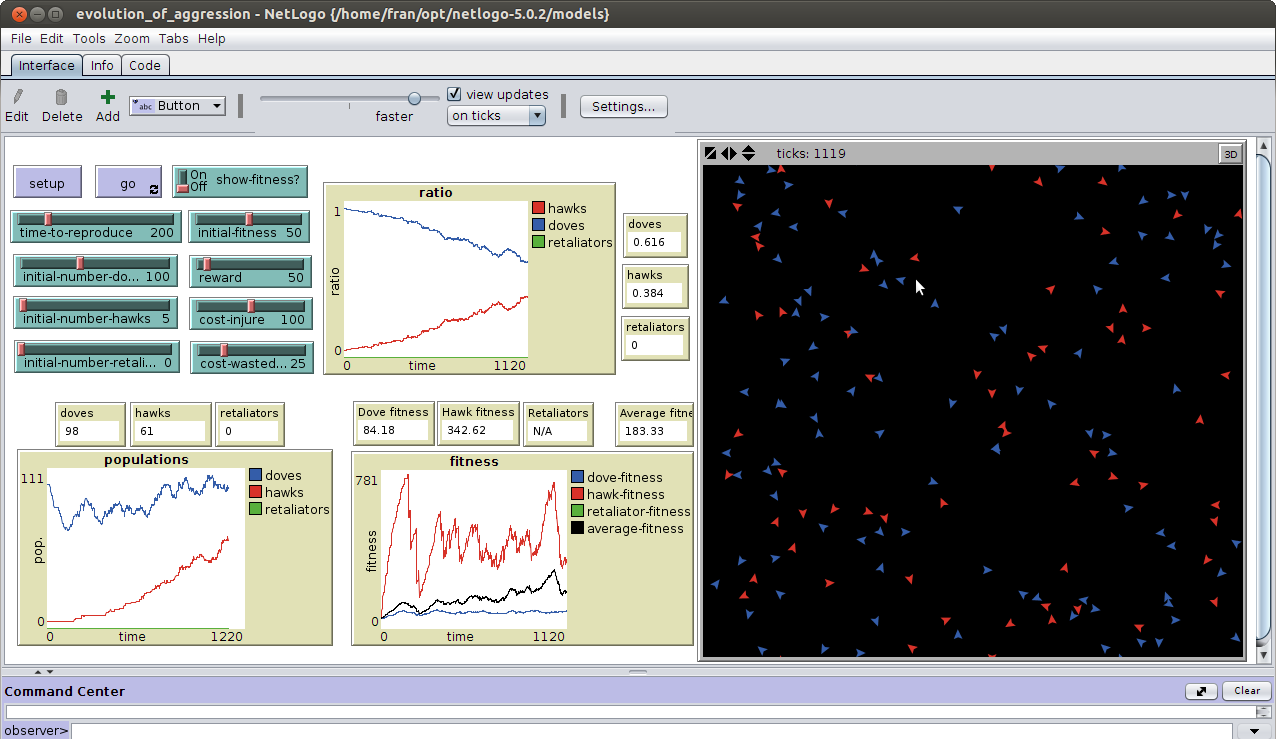 - Look at the monitors to see the current subpopulation sizes, their fitness and ratio.