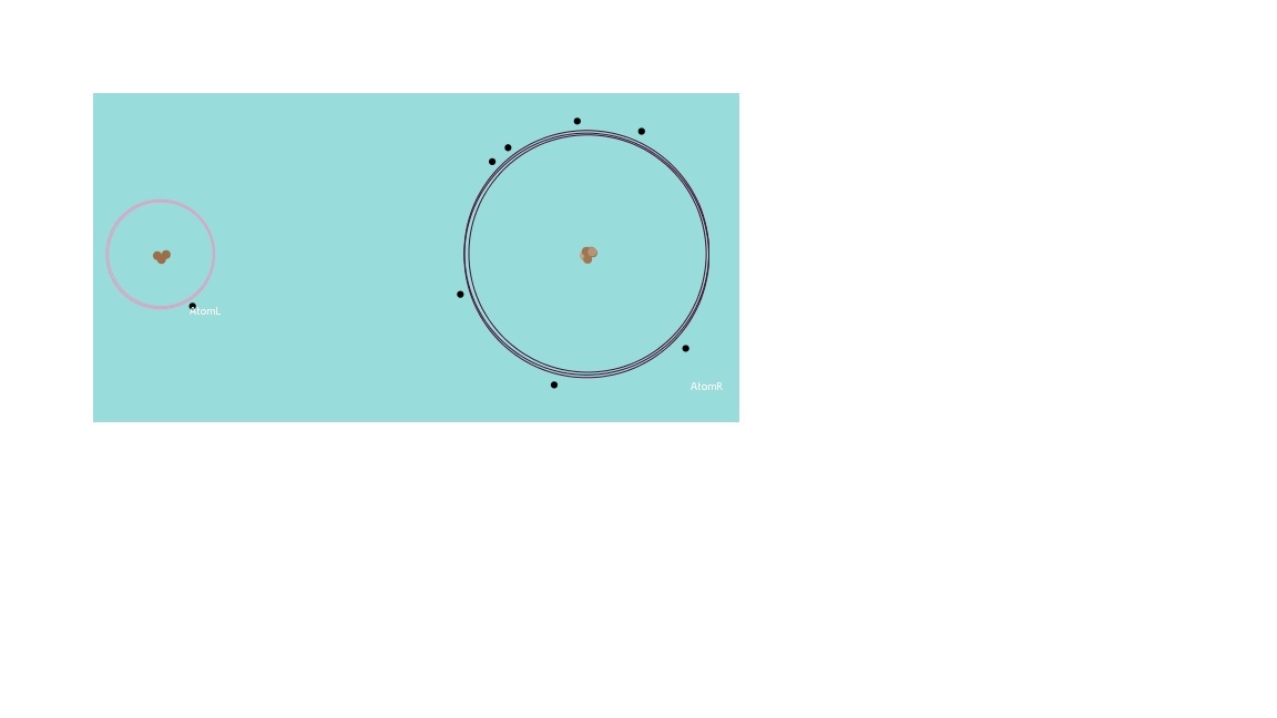 Setting valence electrons of AtomL (the left atom) defines AtomR's valence electrons in a way that both are sum to total of 8 valence electrons. Setting number of valence electrons affect electronegativity and atom's size: When numer of electrons increases - atom's size increases and electronegativity decreases. The electronegativity value is color coded - the atom's circle changes from light purple to dark. When run - the atoms move toward each other and from a certain distance between them, the electrons move from the atom with the lower electronegativity to the second atom.