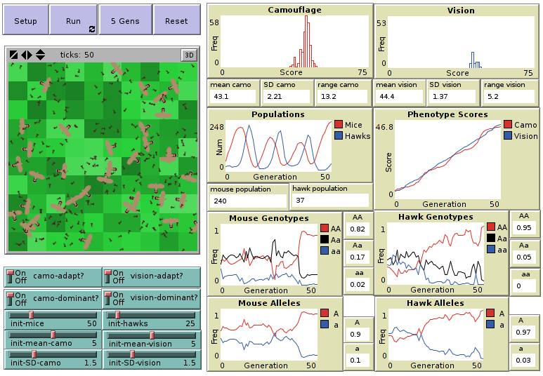 - The init-?, init-mean-? and init-SD-? sliders set the initial population size (mice or hawks), the intial mean value of the adpatations (camouflage or vision) and the variation within the population for each adaptation (camouflage or vision), respectively.