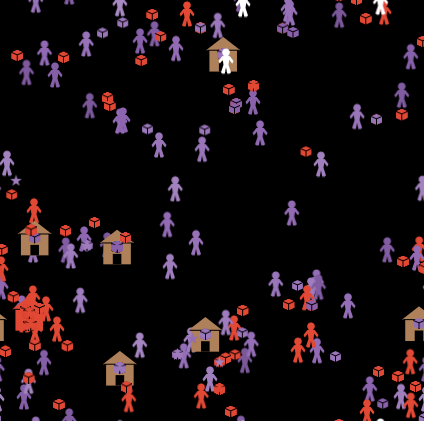 Readers' behavior is determined by several variables: color, expressivity, and money. All readers will seek out books of their own color. They gain money every tick and use money to buy books. Each reader also has an "expressivity" score that increases gradually with each tick; when the expressivity score reaches 1, the reader produces a manuscript and its expressivity score is returned to baseline level. Readers are defined primarily by their "opinion" score. As they move about, the talk to each other, read books, and their opinions gradually change. When a reader's opinion score falls below -.9, it is considered a "radical."
