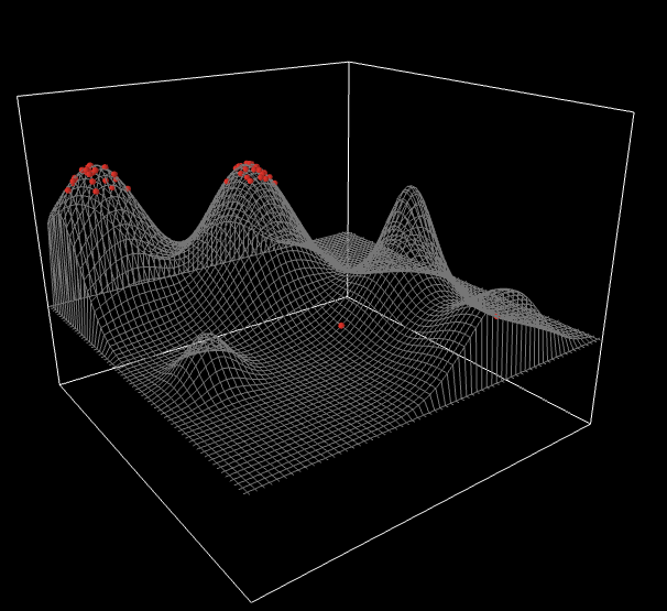 breed [ stayers stayer ] ;; static turtles breed [ walkers walker ] ;; dinamic turrtles globals[t meanfit max-elevation] walkers-own [fitness] stayers-own [f2] to setup clear-all ask patches with [pzcor = 0] [ sprout-stayers 1 [ create-links-with turtles-on neighbors4 ht ;; make the turtle invisible ] ] end to mini-setup ask walkers [die] clear-plot reset-ticks end to create-random-peak [optimx optimy altura gruix] ask stayers [ set f2 f2 + altura * exp ( (-1) * ( ( (xcor - optimx) * (xcor - optimx) + (ycor - optimy) * (ycor - optimy) ) / gruix ) ) ] end to setup-peak ask stayers with [pxcor = max-pxcor or pxcor = min-pxcor or pycor = max-pycor or pycor = min-pycor] [set f2 0] set max-elevation max [f2] of stayers ask stayers [ set zcor (f2 / max-elevation) * ( max-pzcor - 10 ) ;;elevate the points (stayers) ] end ;;;;;;;;;;;;;;;;;;;;;;;;;;;;;;;;;;;;;;;;;;;;;;;;;;;;;;;;;; ;;;;;;;;;;;;;;;;;;;;;;;;;;;;;;;;;;;;;;;;;;;;;;;;;;;;;;;;;; ;;;;;;;;;;;;;;;;;;;;;;;;LANDSCAPES;;;;;;;;;;;;;;;;;;;;;;;; ;;;;;;;;;;;;;;;;;;;;;;;;;;;;;;;;;;;;;;;;;;;;;;;;;;;;;;;;;; ;;;;;;;;;;;;;;;;;;;;;;;;;;;;;;;;;;;;;;;;;;;;;;;;;;;;;;;;;; to create-one-peak ask stayers [set f2 0] create-random-peak random-xcor random-ycor height width setup-peak end to create-two-peaks ask stayers [set f2 0] create-random-peak random-xcor random-ycor height width create-random-peak random-xcor random-ycor height width setup-peak end to landscape1 ask stayers [set f2 0] repeat 10 [ create-random-peak random-xcor random-ycor random-float 1 random-float 30 ] setup-peak end to landscape2 ask stayers [set f2 0] repeat 10 [ let r1 random-xcor let r2 random-ycor let h1 random-float 1 let w1 random-float 150 create-random-peak r1 r2 h1 w1 ;show r1 ;show r2 ;show h1 ;show w1 ] setup-peak end to landscape3 ask stayers [set f2 0] create-random-peak random-xcor random-ycor 1 10 create-random-peak random-xcor random-ycor 0.7 30 create-random-peak random-xcor random-ycor 0.6 40 create-random-peak random-xcor random-ycor 0.4 40 create-random-peak random-xcor random-ycor 0.2 40 setup-peak end to landscape4 create-random-peak 15 15 1 40 create-random-peak -15 -15 1 40 create-random-peak 15 -15 1 40 create-random-peak -15 15 1 40 setup-peak end to setup-flattest create-random-peak 10 0 0.3 600 create-random-peak -15 0 1 6 setup-peak end ;; Crear les tortugues to crear-elements ask n-of num-turtles stayers[ hatch-walkers 1 [ st set color red set shape "circle" ] ] reset-ticks end ;;;;;;;;;;;;;;;;;;;;;;;;;;;;;;;;;;;;;;;;;;;;;; to p1 repeat 50 [ create-random-peak random-xcor random-ycor 1 50 ] setup-peak end ;;;;;;;;;;;;;;;;;;;;;;;;;;;;;;;;;;;;;;;;;;;;;;;;;;;;;;;;;;;;;; ;;;;;;;;;;;;;;;;;;;;;;;;;;;;;;;;;;;;;;;;;;;;;;;;;;;;;;;;;;;;;; ;;;;;;;;;;;;;;;;;;;;;;;;IMPLEMENTATION;;;;;;;;;;;;;;;;;;;;;;;; ;;;;;;;;;;;;;;;;;;;;;;;;;;;;;;;;;;;;;;;;;;;;;;;;;;;;;;;;;;;;;; ;;;;;;;;;;;;;;;;;;;;;;;;;;;;;;;;;;;;;;;;;;;;;;;;;;;;;;;;;;;;;; to random-walk ask walkers [ let here one-of stayers-here let there one-of [link-neighbors] of here move-to there ] end to algoritm ask walkers [ set fitness sum [f2] of stayers-here ] set meanfit mean [fitness] of walkers let survivor turtle-set (walkers with [fitness >= meanfit]) let extinct turtle-set (walkers with [fitness < meanfit]) ask extinct [ if random-float 1 < probcol;; the turtle die [ let a one-of stayers setxyz [xcor] of a [ycor] of a [zcor] of a ] if random-float 1 < 1 - probcol;;the mother turtle has a "baby" [ if count survivor != 0 [ let b one-of survivor let c stayers with [ xcor = [xcor] of b and ycor = [ycor] of b and zcor = [zcor] of b ] move-to one-of [link-neighbors] of one-of c ] ] ] end to go if ticks = 1000 and j300 [stop] tick repeat evolutive-speed [random-walk] algoritm set-current-plot-pen "pen-1" plotxy ticks meanfit end