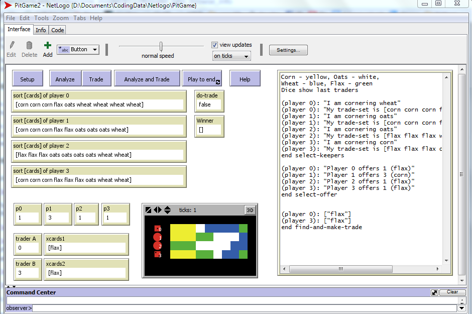 In the simulation there are 4 players (0,1,2,3) and 4 commodities (wheat, corn, oats, and flax). There are 9 cards for each commodity. The players try to 'corner the market' by trading with each other to get all 9 cards of a commodity. When a player gets all the cards of a commodity, he is the winner.