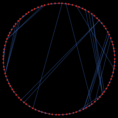 ;;;;;;;;;;;;;;;;;;;;;;;;;; ;;;; Setup Procedures ;;;; ;;;;;;;;;;;;;;;;;;;;;;;;;; to setup clear-all set-default-shape turtles "circle" create-initial-substrate reset-ticks end to create-initial-substrate create-turtles number_of_nodes ask turtles [ set color red facexy 0 0 set size 3 ] let n 0 while [n < number_of_nodes] [ make-edge turtle n turtle ((n + 1) mod count turtles) set n n + 1 ] layout-circle (sort turtles) max-pxcor - 5 end ;;;;;;;;;;;;;;;;;;;;;;;; ;;;; Main Procedure ;;;; ;;;;;;;;;;;;;;;;;;;;;;;; to go let terminate False ;; 1 - fix a vertex i ;; ask iterate once over all turtles in random order ask turtles [ ;; 2 - for every other vertex j compute Rij according to equation: ;; 1 if mij >= k ;; (mij/k)^alfa * (1 - p) + p if k > mij > 0 ;; p if mij = 0 ;; where mij is the number of vertices that are adjacient both to i and j ;; with the additional constraint that Rij = 0 if i and j are already connected let Rij n-values (number_of_nodes)[0] let others [who] of other turtles foreach others [ ; if it is a neighbor of i we already set Rij to 0 if not link-neighbor? turtle ? [ ;; Get the number of vertices that are adjacent both to i and j ; neighbors of i let i_neighbors link-neighbors ; neigbors of j let j_neighbors [link-neighbors] of turtle ? let mij 0 foreach [who] of i_neighbors [ if member? ? ([who] of j_neighbors) [ set mij (mij + 1) ] ] ; ? variable referes to current item in others list. ; Since others list is a list of turtle IDs I can use ? as an index in Rij list. if mij >= k [ set Rij replace-item ? Rij 1 ] if mij < k and mij > 0 [ set Rij replace-item ? Rij ( (mij / k) ^ alfa * (1 - p) + p ) ] if mij = 0 [ set Rij replace-item ? Rij p ] ];; END_if ];; END_foreach ;; 3 - Sum Rij over all j, and normalize each to obtain variables Pij = Rij / Sum_l!=i Ril. ;; Then since Sum_j Pij = 1, we can interpret Pij as the probability that i will connect to j. ;; Furthermore, we can interpret Pij geometrically as follows: divide the unit interval (0,1) ;; into n - 1 half-open subintervals with length Pij for all j != i. let sum_of_Rij sum Rij let Pij map [? / ifelse-value (sum_of_Rij > 0) [sum_of_Rij] [1] ] Rij ;; 4 - A uniform random variable r is then generated on (0,1). ;; it must fall into one of the subintervals, corresponding to j* let j* (jstar others Pij) ;; 5 - Connect i to j* if j* != -1 [ make-edge turtle who turtle j* ] ;; Stop when reach this threshold if count links >= (k * number_of_nodes / 2) [ set terminate True stop ; exit ask turtles ] ];; END_ask turtles if terminate [ stop ] tick end to-report jstar [others Pij] let r random-float 1 while [ r = 0 ] [ set r random-float 1 ] ; random-float might includes 0, even though it is unlikely let partial-sum 0 foreach others [ set partial-sum partial-sum + (item ? Pij) if partial-sum > r ; it is the same as if r > partial-sum and r < (partial-sum + (item ? Pij)) [ report ? ] ] report -1 end ;;;;;;;;;;;;;;;;;;;;;;;;; ;;;; Link Procedures ;;;; ;;;;;;;;;;;;;;;;;;;;;;;;; ;; connects the two turtles to make-edge [node1 node2] ask node1 [ create-link-with node2 [ set color blue ] ] end to relayout ; layout-spring turtle-set link-set spring-constant spring-length repulsion-constant layout-spring turtles links 0.2 25 5 end