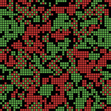 When you execute SETUP, the red and green agents are randomly distributed. Due to the rules described in section HOW IT WORKS, agents change colors and move. Eventually the system reaches a fixed state with three types of clusters - green, red and chessboard-like. Click 'go-once' button and notice that the chessboard-like structure periodically changes and thus corresponds to customers without permanent opinion (disloyal).