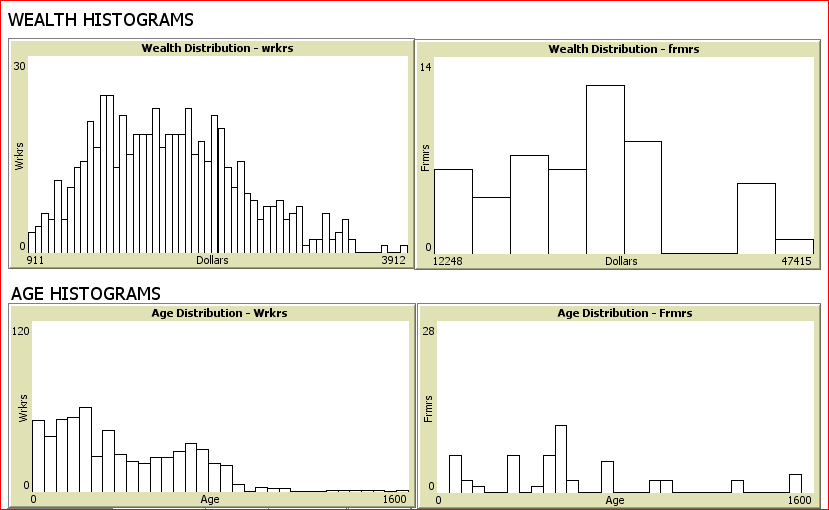 The three conserved quantities are monitored in the displays to the right at the top of the main panel. Note that the totals do not change. Aggregates for frmrs and wrkrs are also shown. The amounts held by the immortal agents are included in the conserved totals, but not in this block of monitor boxes. To see them, look below and to the right.