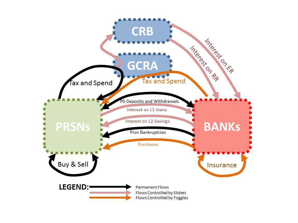 There are several channels by which money flows from the real economy (the economy of prsns, the GCRA and the CRB) to the financial economy (the economy of the chartered banks). There are other channels by which money flows back from the financial economy to the real economy. The user can open and/or regulate the flows in either direction, and watch the long-term effects on the two economies.