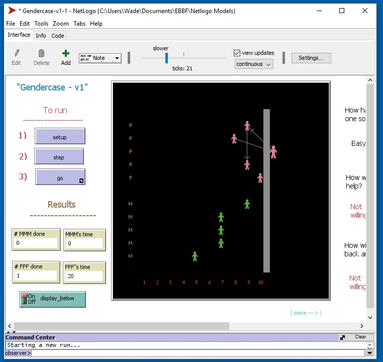 Clicking SETUP puts two teams on the board, color coded and labelled. Clicking STEP will advance the clock 1 tick, and some of the agents will complete their tasks and move one step to the right. Clicking GO ( "run/puase") will let the clock run until either all the work is done or the game hits a safety timeout and stops; the team members will migrate at different speeds across the board to the finish line.