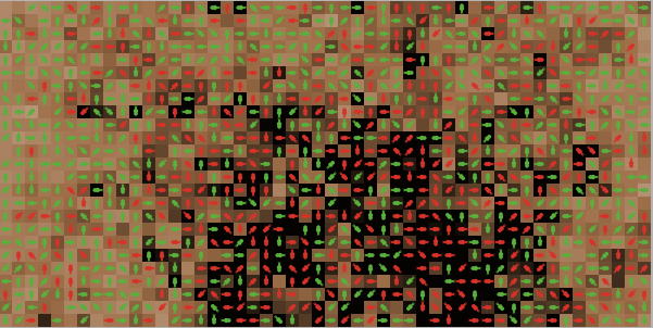 turtles-own [ harvest-type harvest-amount harvest energy myCommons ] globals [ commonsResources Tragfähigkeit Wachstumsrate ] patches-own [resource] ;;;;;;;;;;;;;;;;;;;;;; ;;;Setup Procedures;;; ;;;;;;;;;;;;;;;;;;;;;; to setup clear-all set Tragfähigkeit 100 set Wachstumsrate 0.3 setup-patches setup-turtles ask turtles [ if Agenten = "Menschen" [ set shape "person" set size 1] if Agenten = "Bakterien" [ set shape "bacteria" set size 1.2] if Agenten = "Kreise" [ set shape "circle" set size 0.8] ifelse harvest-type = "sustainable" [set color green ] [set harvest-type "greedy" set color red] ] reset-ticks end to setup-patches ask patches [ set resource ( 75 + random (Tragfähigkeit / 4)) set pcolor scale-color brown resource 0 (Tragfähigkeit + 30) ] end to setup-turtles ask n-of 50 patches [sprout 1 [set energy Lebenshaltungskosten + 1]] ask n-of Nachhaltige turtles [ set harvest-type "sustainable"] end ;;;;;;;;;;;;;;;;;;;;;;;; ;;;Runtime Procedures;;; ;;;;;;;;;;;;;;;;;;;;;;;; to go if count turtles = 0 [stop] ask turtles [ ifelse harvest-type = "sustainable" [set harvest-amount Erntemenge-nachhaltig ] [set harvest-amount Erntemenge-gierig ]] ask turtles [ if Agenten = "Menschen" [ set shape "person" set size 1] if Agenten = "Bakterien" [ set shape "bacteria" set size 1.2] if Agenten = "Kreise" [ set shape "circle" set size 0.8]] move harvest-patch livingcosts if Fortpflanzung [reproduce] death ask patches [ regrow recolor] tick end to move ;;turtle procedure ask turtles [ let nextpatch max-one-of (patches in-radius 2 with [not any? turtles-here] ) [resource] if nextpatch != nobody [ face nextpatch move-to nextpatch] ] end to harvest-patch ask turtles [ ifelse [resource] of patch-here > harvest-amount [set harvest harvest-amount ask patch-here [ set resource resource - [harvest-amount] of myself]] [set harvest [resource] of patch-here ask patch-here [set resource 0] ] set energy energy + harvest ] end to harvest-area ;; from Waring et al., 2017 ask turtles [set commonsResources sum ([resource] of myCommons) ;; sums all of the resources in my commons let commonsList sort-on [resource] myCommons ;; sort the list by the amount of resource on the patch set commonsList reverse commonsList ;; reverse the sort list so it is largest to smallest ifelse commonsResources < harvest-amount ;; if the total commons are less than what the agent wants to harvest [ set harvest (commonsResources); - ( count myCommons * 0.1 )) ask myCommons [ set resource 0 ] ;; take everything from the commons ] [ while [harvest < harvest-amount][ ;; while you are still in need ;; harvest some resource from the neighborhood foreach commonsList [ ?1 -> ifelse [resource] of ?1 <= (harvest-amount - harvest) [set harvest (harvest + [resource] of ?1 ) ask ?1 [set resource 0] ] [ask ?1 [ set resource (resource - ([harvest-amount] of myself - [harvest] of myself)) ] set harvest harvest-amount ] ] ;; end foreach ] ;; end while ;;set agentResource floor (agentResource + harvestAmt) ] ;; end second part of ifelse commonsResources set energy energy + harvest ] end to livingcosts ask turtles [set energy energy - Lebenshaltungskosten] end to reproduce ask turtles [ let neighborhood (patch-set neighbors with [not any? turtles-on self ]) if (any? neighborhood) and random-float 1 < ( 0.001 * energy );;/ 100) [hatch 1 [ mutate set energy ([energy] of myself / 2) move-to one-of neighborhood ] set energy (energy / 2) ] ] end to mutate ;; turtle procedure if random-float 100 < Mutationsrate [ifelse harvest-type = "sustainable" [set harvest-type "greedy"] [set harvest-type "sustainable"] ] update-color end to update-color ifelse harvest-type = "sustainable" [ set color green ] [ set color red ] end to death ask turtles [if energy <= 0 [die] if random-float 100 < Sterberate [ die ]] end to regrow ;; patch ifelse resource > 0 [set resource precision (resource + ((Wachstumsrate * resource) * (1 - (resource / Tragfähigkeit )))) 3] [ set resource 0.1] end to recolor ;; patch set pcolor scale-color brown resource 0 (Tragfähigkeit + 30) end ;;; turtles1 variables to-report average-energy-greedys report sum [energy] of turtles with [harvest-type = "greedy"] / count turtles with [harvest-type = "greedy"] end to-report average-energy-sustainables report sum [energy] of turtles with [harvest-type = "sustainable"] / count turtles with [harvest-type = "sustainable"] end