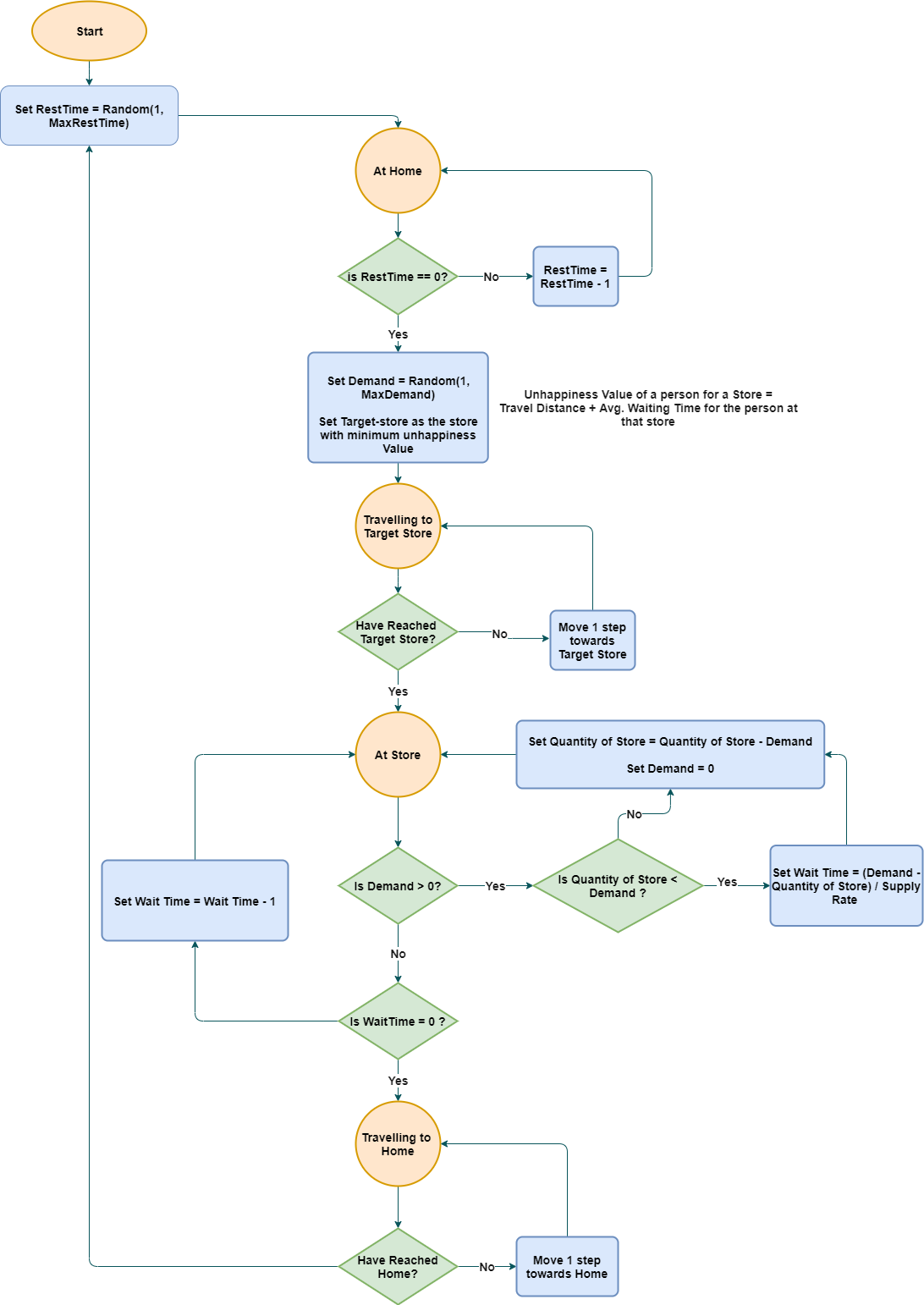In a single discrete time unit, the execution in the flow chart of customer reaches a "flowchart state" (can be same as previous) from the previous "flowchart state". The figure below explains the cycle of actions for the customer. - The customer performs actions as per the current state in the flowchart. Accordingly, it moves or sets some state variables such as restTime, waitTime or completes an order transaction at a store in a single time unit. - A customer is initially at the home location with a random RestTime between 1 and Max Rest time. - With every tick, the rest time of the customer decreases by 1, if the customer is at home. - When the rest time becomes zero, the customer makes a decision to which store to visit based on the store with least unhappiness value. (Unhappiness of a customer with respect to a store = Travelling distance from store + Average waiting time at the store) - The state of the customer changes from "at home" to "travelling to store" and starts moving towards target-store. - On reaching the target store, the state of customer is changed to "at store". On visit, the customer updates the quantity at store, the demand value. In case the quantity at the store is less the customer's demand, then the customer has to wait for the given time. WaitTime = (Customer's demand - Quantity at Store) / Supply Rate - Once the waiting time is over, the customer starts to move towards home location. - Once reaching the home, the restTime is set in Random(1 , max-restTime). - When the restTime becomes zero, the customer repeats the above steps starting from making a decision to which store to visit based on unhappiness value for each store for the given customer.