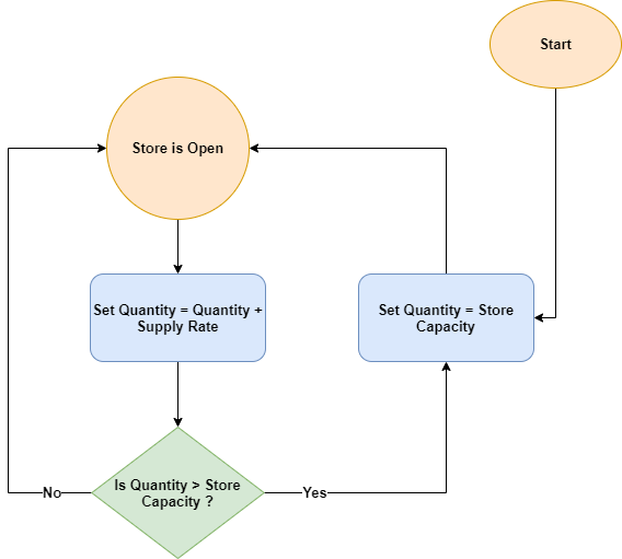 • After the customers have performed their respective actions, the stores update the quantity as per the supply rate. The order of stores execution is random and is unimportant.