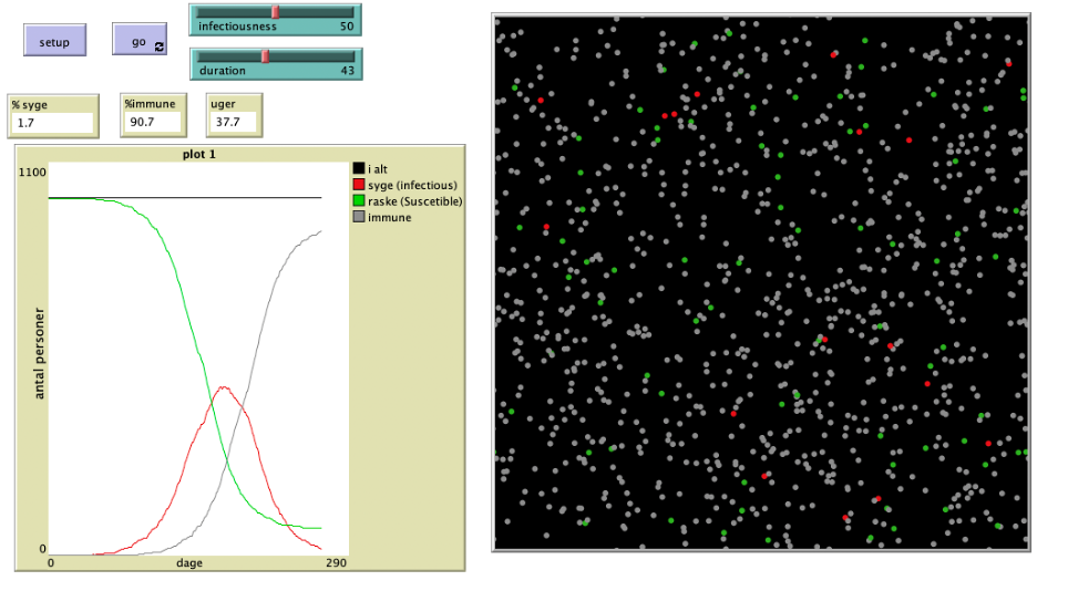 Modellen er simulerer epidemimodellen, SIR, hvor der optræder modtagelige (suscetible) og inficerede (infected) og recovered. SIR-modellen er et godt eksempel på koblede differentialligninger der ikke kan løses analytisk, men kan løses numerisk med Eulers metode eller andre numeriske metoder.