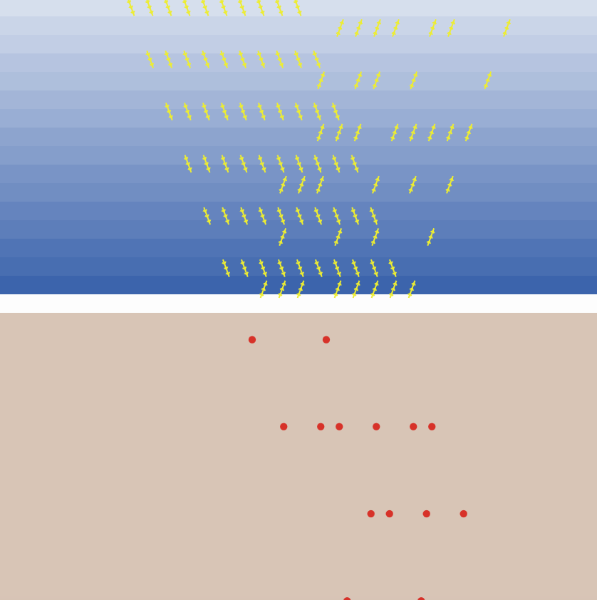 Gule stråler kommer ned i bunter af 10 på en linje, fra en område i venstre side. Når de rammer jordovefladen har de hver for sig 30% change for at blive absorberet, hvorved der skabes varmestråling i jordlaget. Hvis strålen ikke bliver absorberet bliver den reflekteret tilbage til himlen. Dvs at der er 70% sandsynlighed for at sollyset bliver bliver reflekteret.